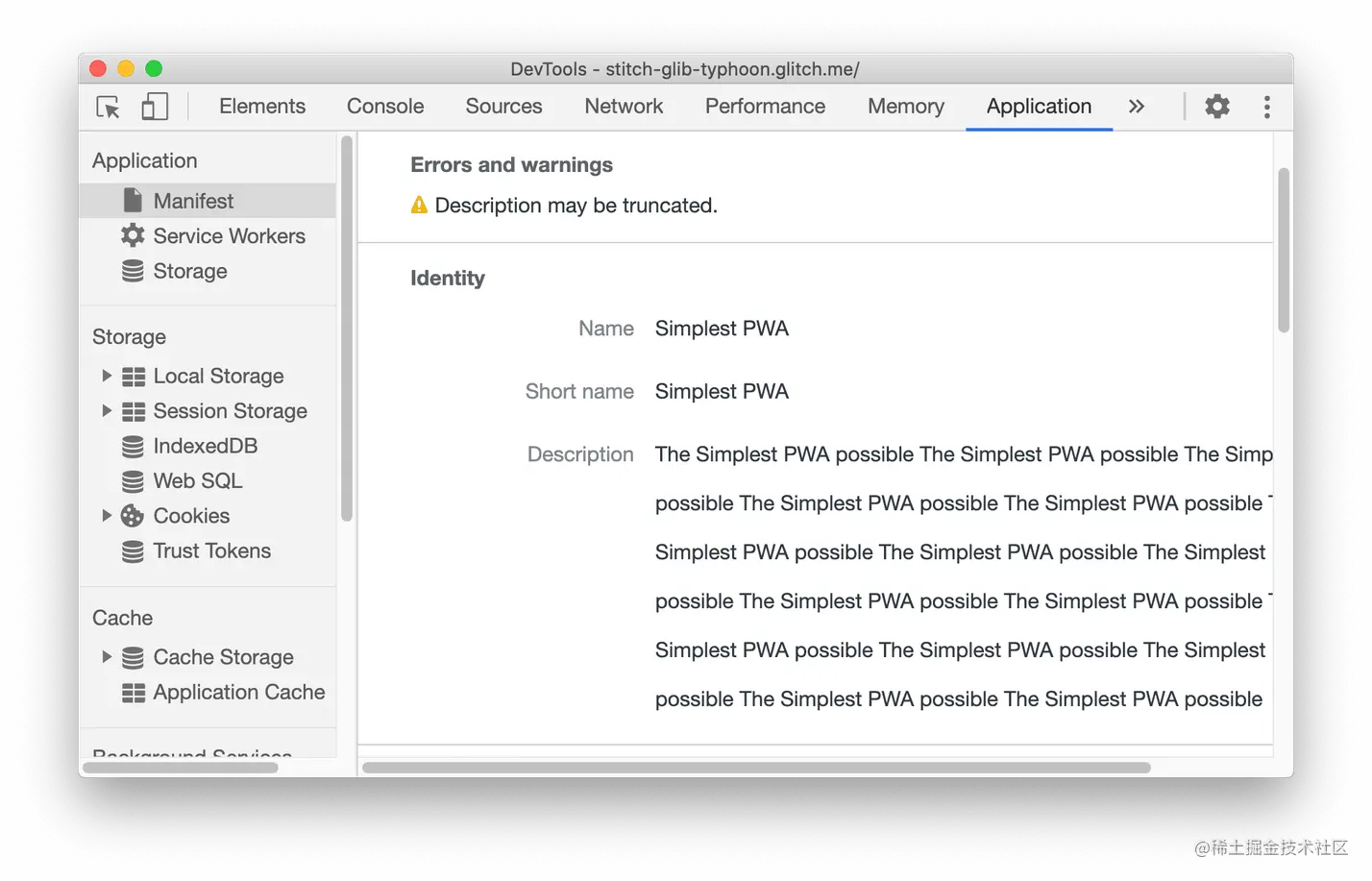 如果 PWA manifest 的 description 超过 324 个字符,在 Manifest 面板里会展示警告信息。