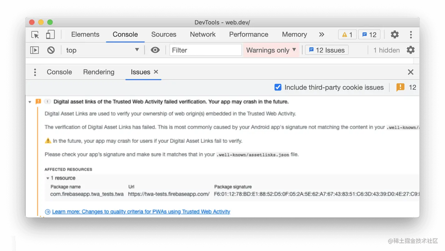 打开一个 Trusted Web Activity 应用,然后通过点击 Console 状态栏上的 issue 数量按钮来打开 Issues 标签,issue 的详细信息就会展示出来了。