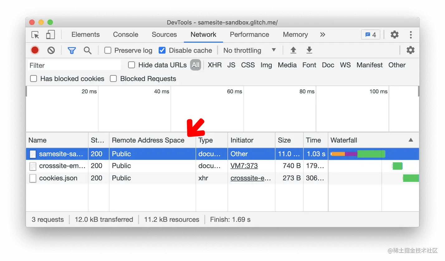 每个网络请求的 IP 地址空间可以在 Network 中的 Remote Address Space 进行查看。