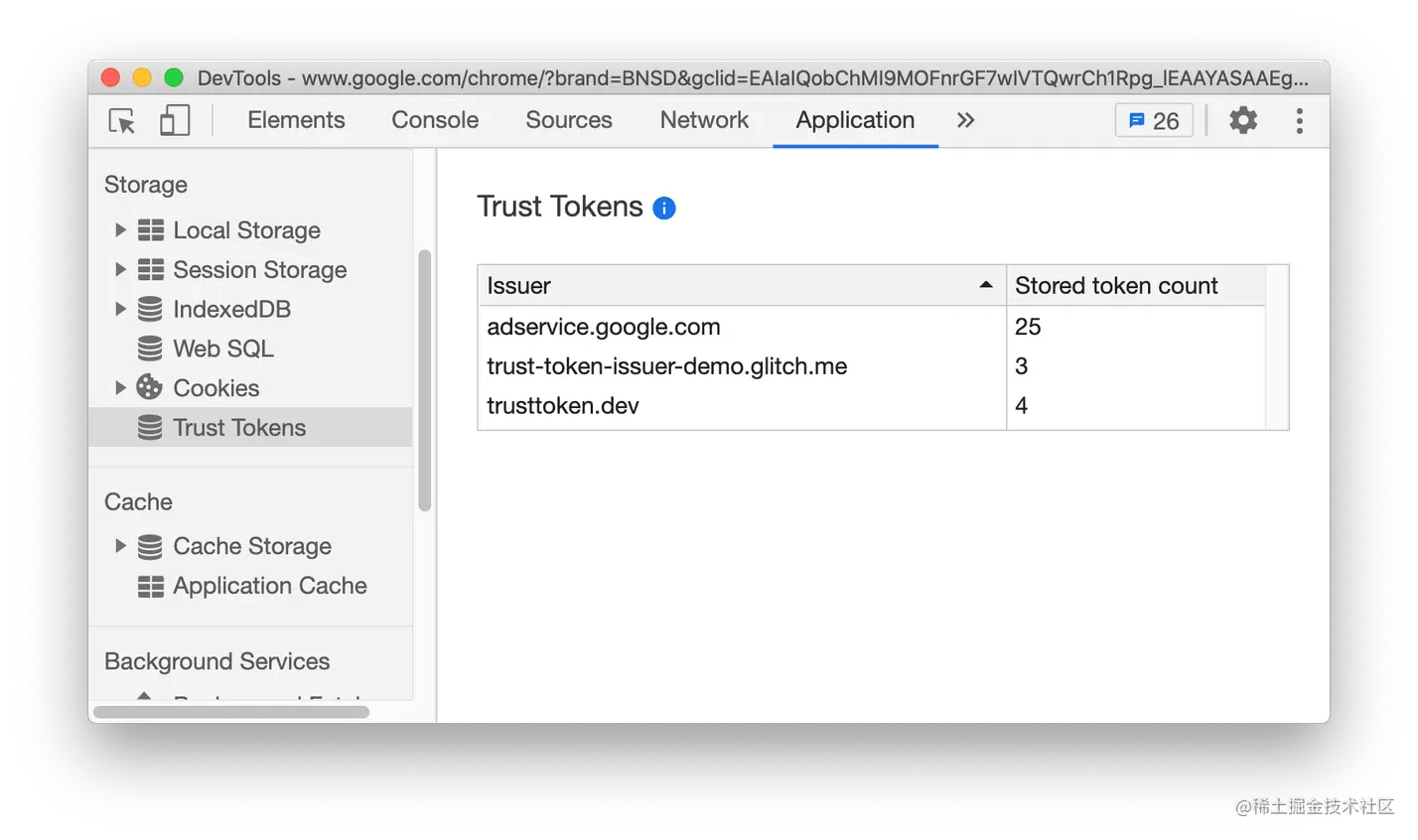DevTools 在 Application 面板中加了一个叫 Trust Tokens 新面板,用于展示在当前浏览上下文中可用的 Trust Tokens。Trust Token 是一种新的 API,用于帮助打击欺诈行为,并将机器人与真人区分开来,无需被动跟踪。