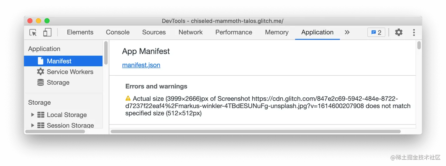 如果 PWA manifest 的 screenshot 不符合要求,在 Manifest 面板里会展示警告信息。