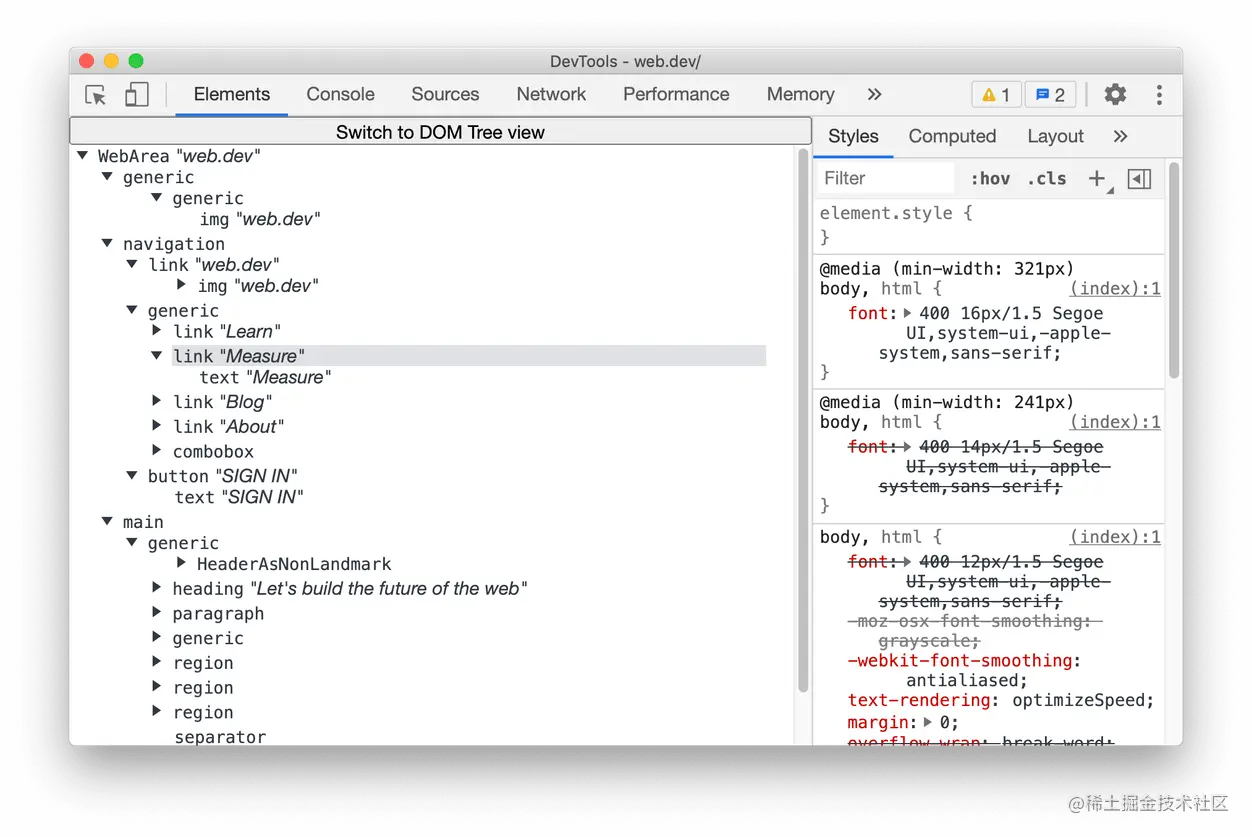 在 Elements 面板中, 点击顶部的 Switch to Accessibility Tree view 切换到 accessibility tree 视图。