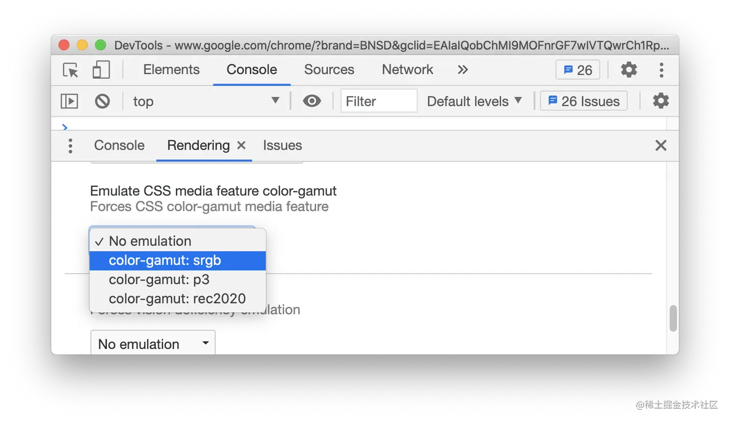 打开 Command 目录,执行 Show Rendering 命令,选择 Emulate CSS media feature color-gamut 下拉选项,就可以设置相关属性值了。