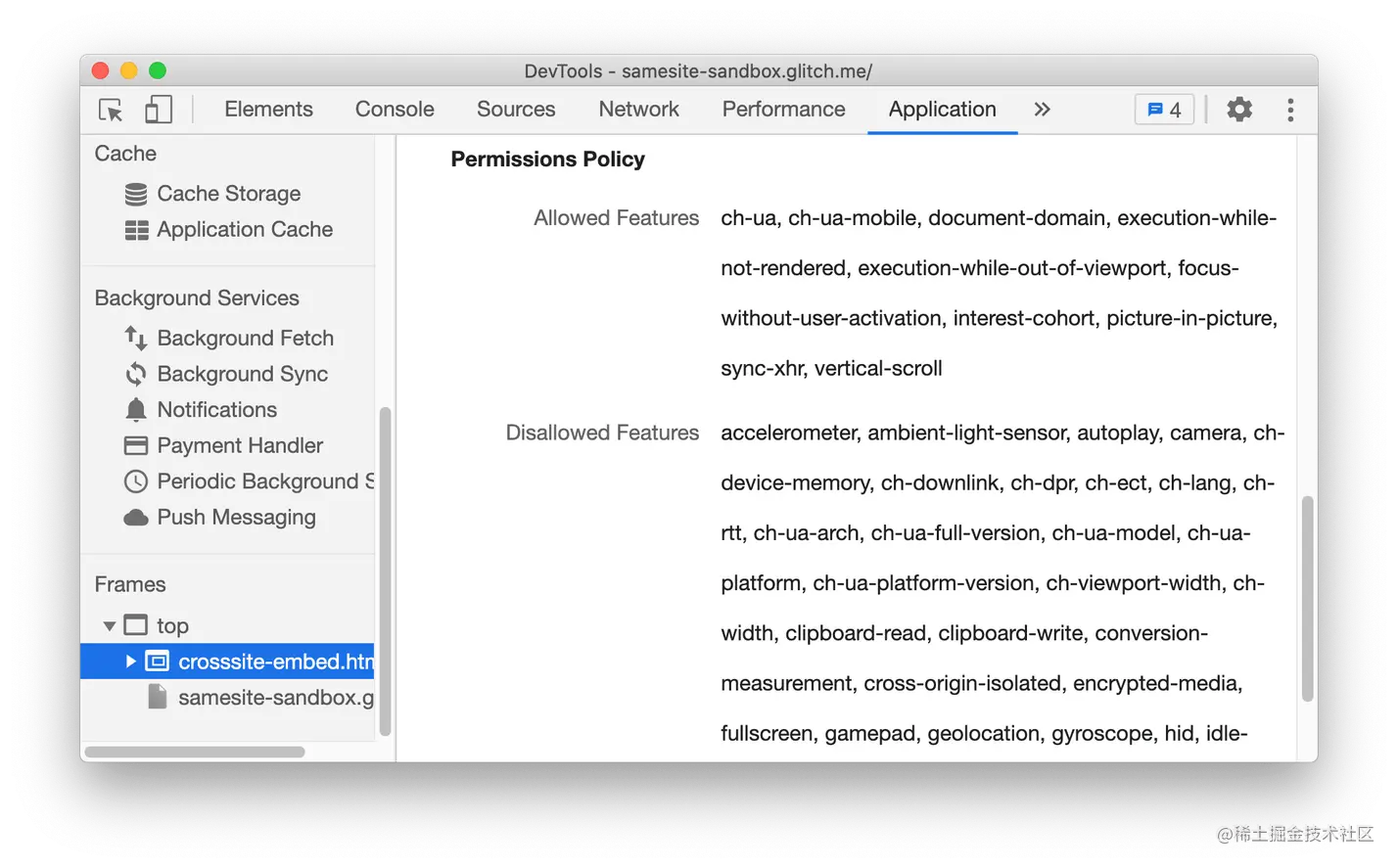 在 Frame 详情视图中显示由 Permissions policy 控制的允许和不允许的功能列表。