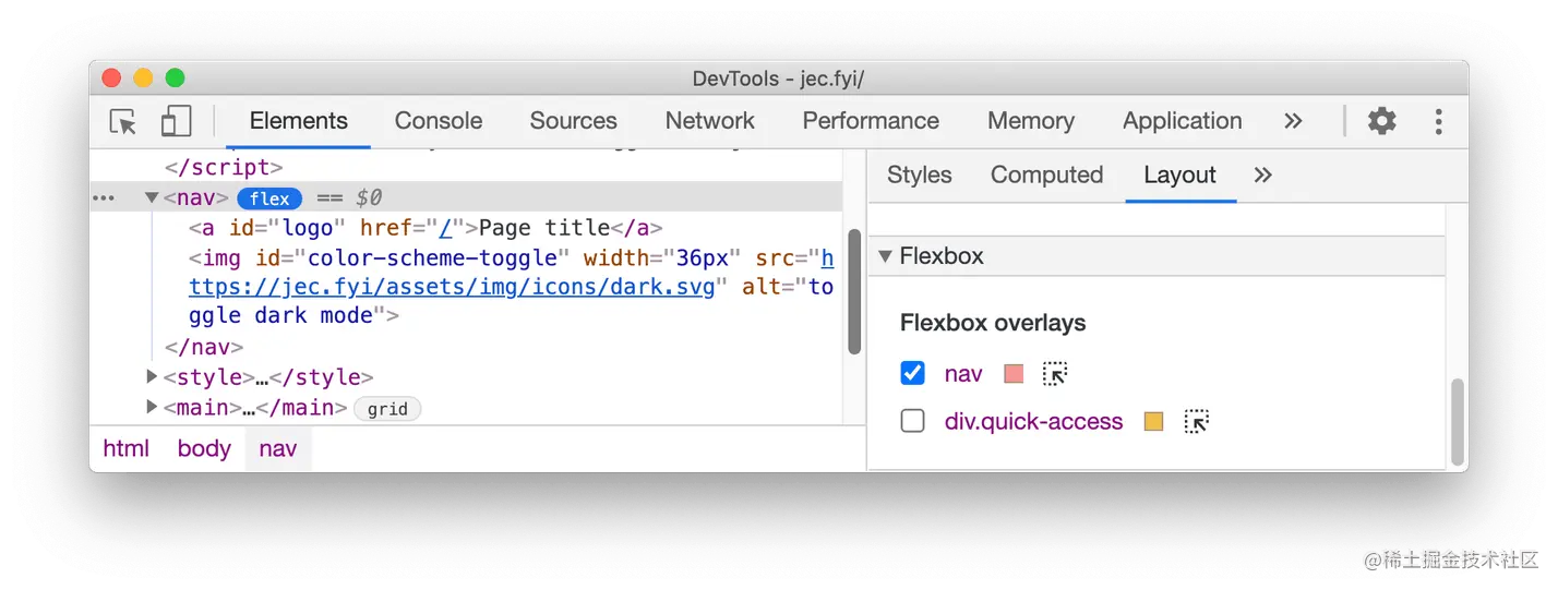 另外,在 Layout 面板中,有一个 Flexbox 区域会展示页面中所有的 flexbox,可以快速的触发某个元素的 flex 布局浮层。