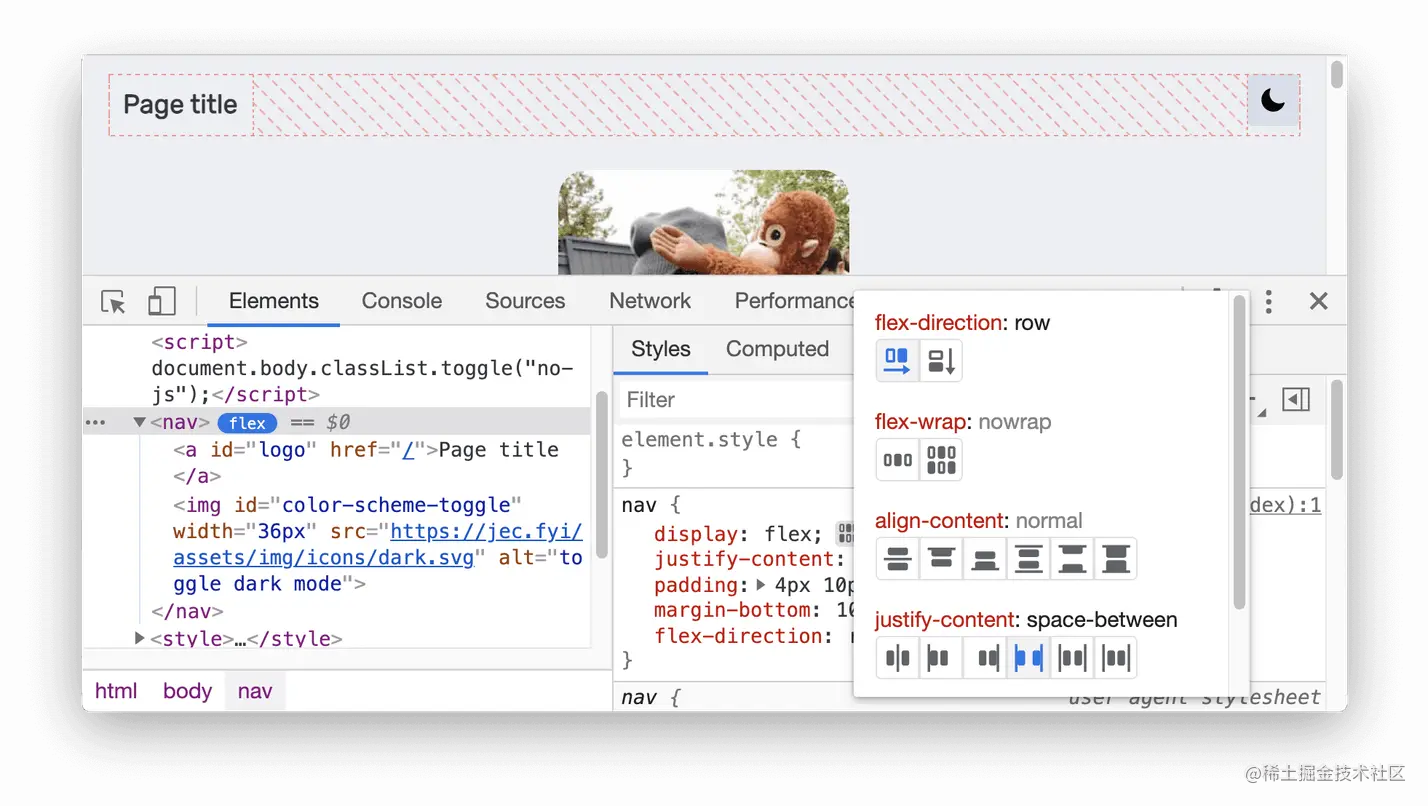 当 HTML 元素的 CSS 样式被设置为 display: flex 或 display: inline-flex 的时候,在 Elements 面板中该元素的后面会有一个 flex 标记,当点击这个标记后,在页面上会展示 flex 布局浮层。在 Styles 面板中,点击 display: flex 或 display: inline-flex 后面的图标,可以打开 Flexbox 编辑器,可以快速的编辑 flexbox 属性。