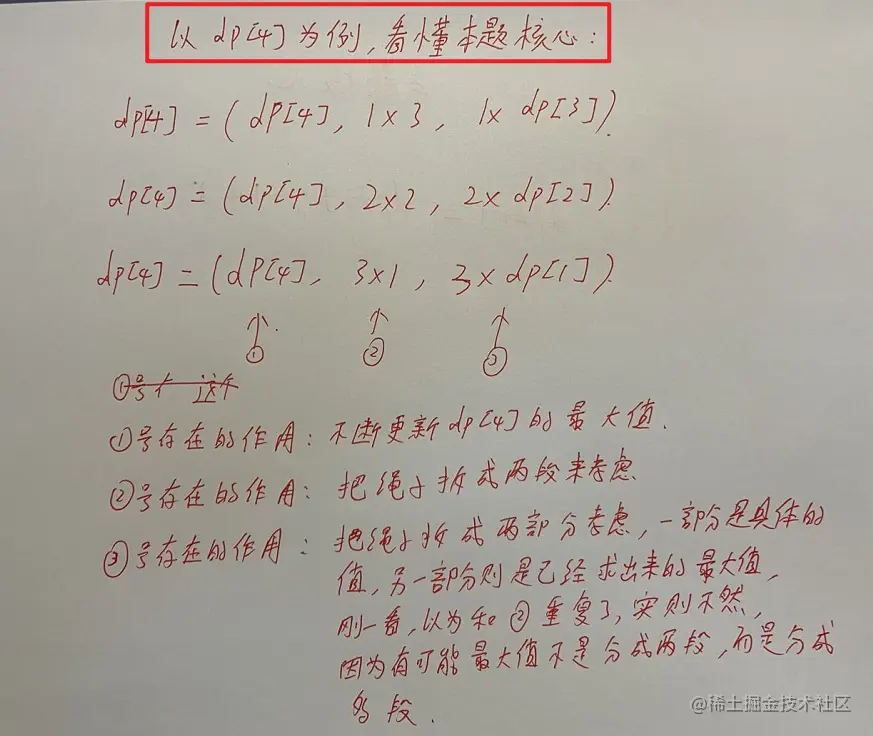 - 动态规划的结束条件是dp[2]=1,因为2米的绳子可以拆成1+1,最后的乘积是1