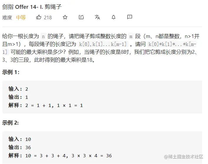 // 动态规划的结束条件是dp[2] = 1 代表的含义是长度为2的绳子剪成几段后最大乘积是1