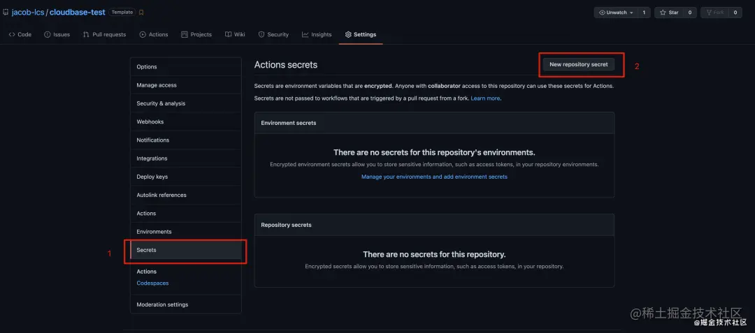 既然不能上传的话,我们应该如何配置呢,答案很简单,使用 GitHub secret 即可。需要在 腾讯云控制台 新建秘钥,新建完成后,打开你的 GitHub 仓库进行如下设置: