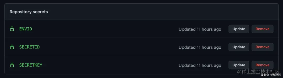 创建 ENVID、SECRETID、SECRETKEY 三条 secret,其中 ENVID 在 应用列表中可见,配置完成后如下所示: