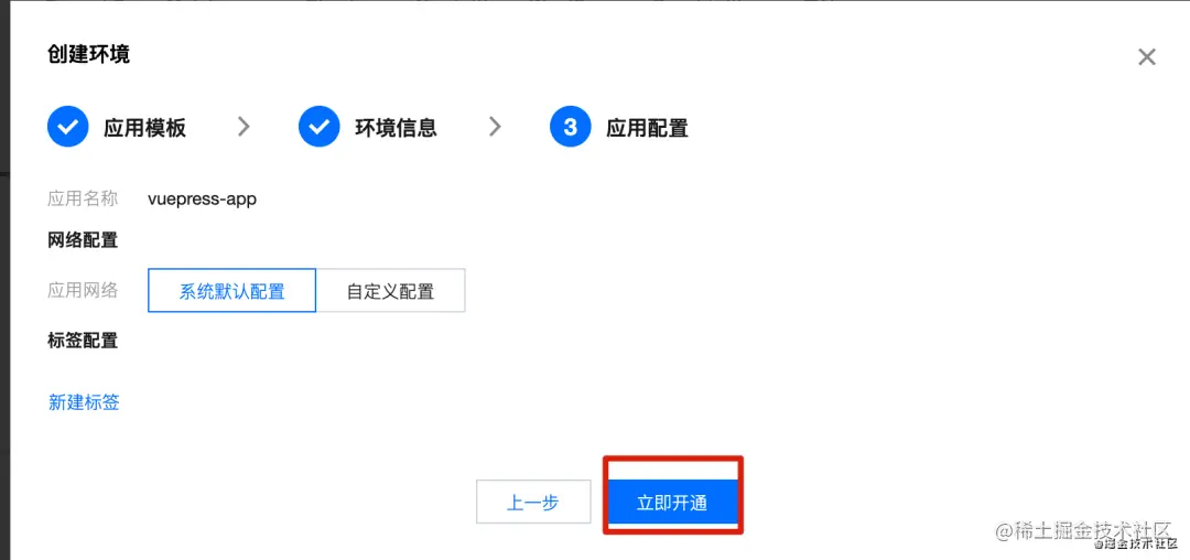 接下来会选择关联环境,如果你当前没有环境的话可直接选择「创建新环境」,CLI 会自动打开浏览器跳转到「创建新环境」页面,创建新环境如下图,在这里我选择使用 VuePress 模板进行创建: