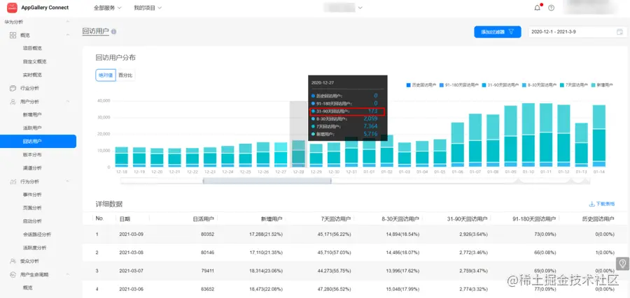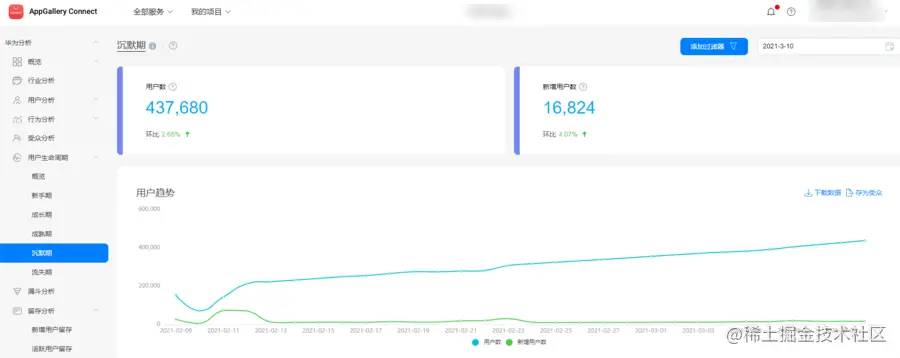 通过华为分析的用户生命周期报告,可以直观看到沉默期、流失期用户的规模及变化趋势。