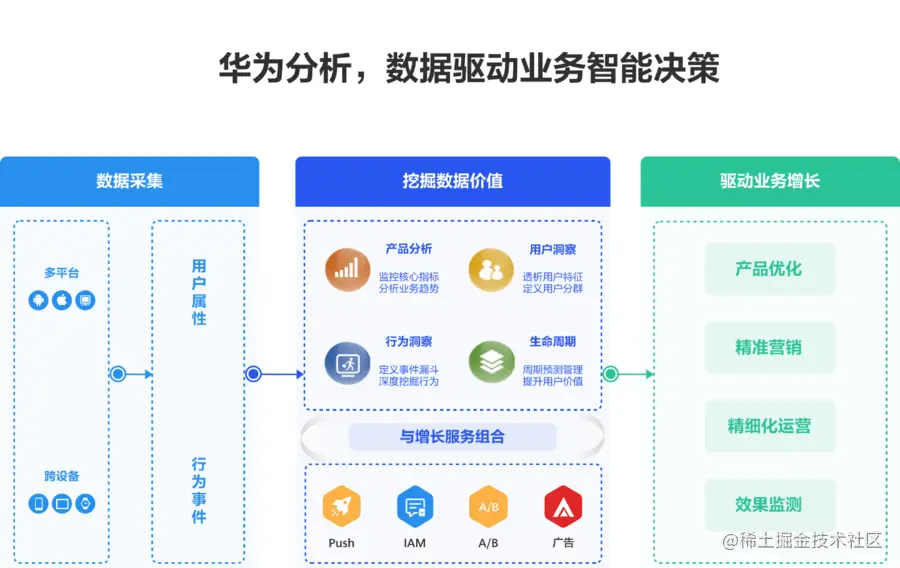 华为分析服务(Analytics Kit)是针对移动应用、Web、快应用等产品的一站式用户行为分析平台,贴合业务场景,提供数据采集、数据管理、数据分析、数据应用的一体化解决方案,驱动企业实现精准拉新、产品优化、精益运营、业务增长。