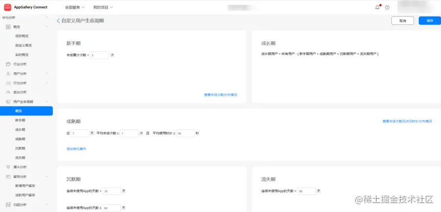 同时华为分析还提供了用户生命周期模型,您可以自定义APP各个生命周期阶段的用户统计口径。