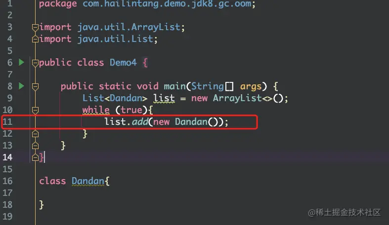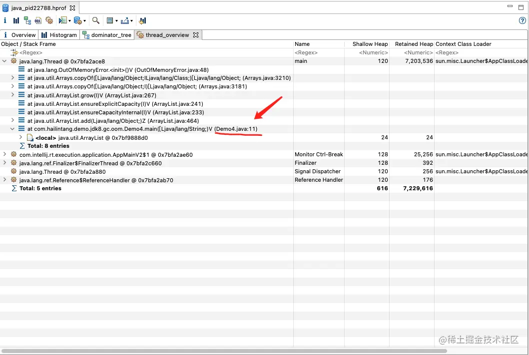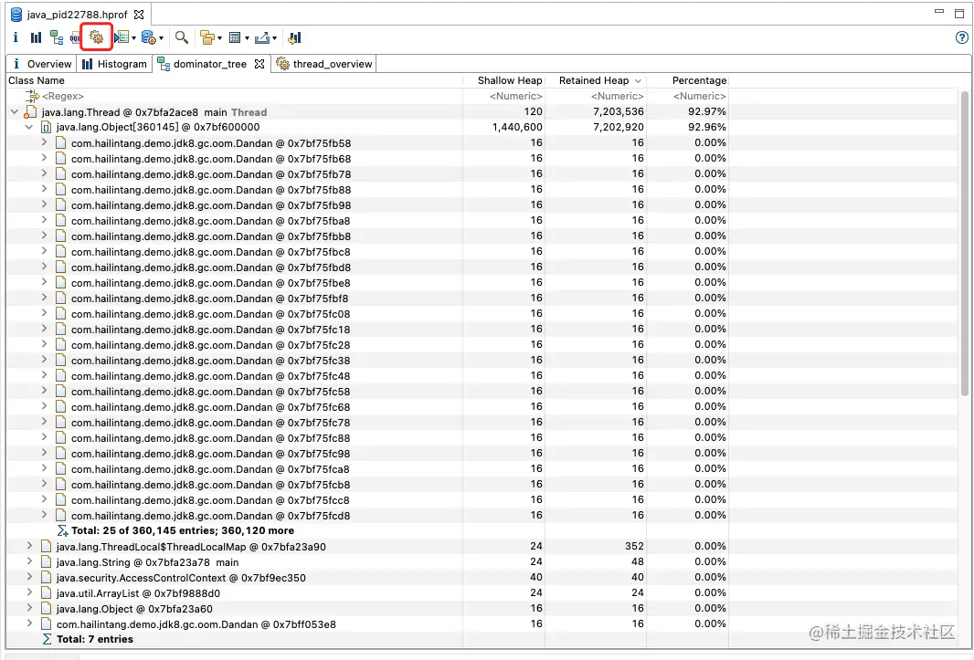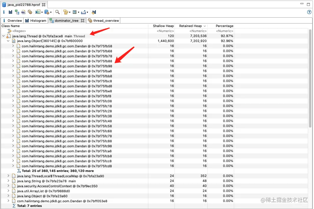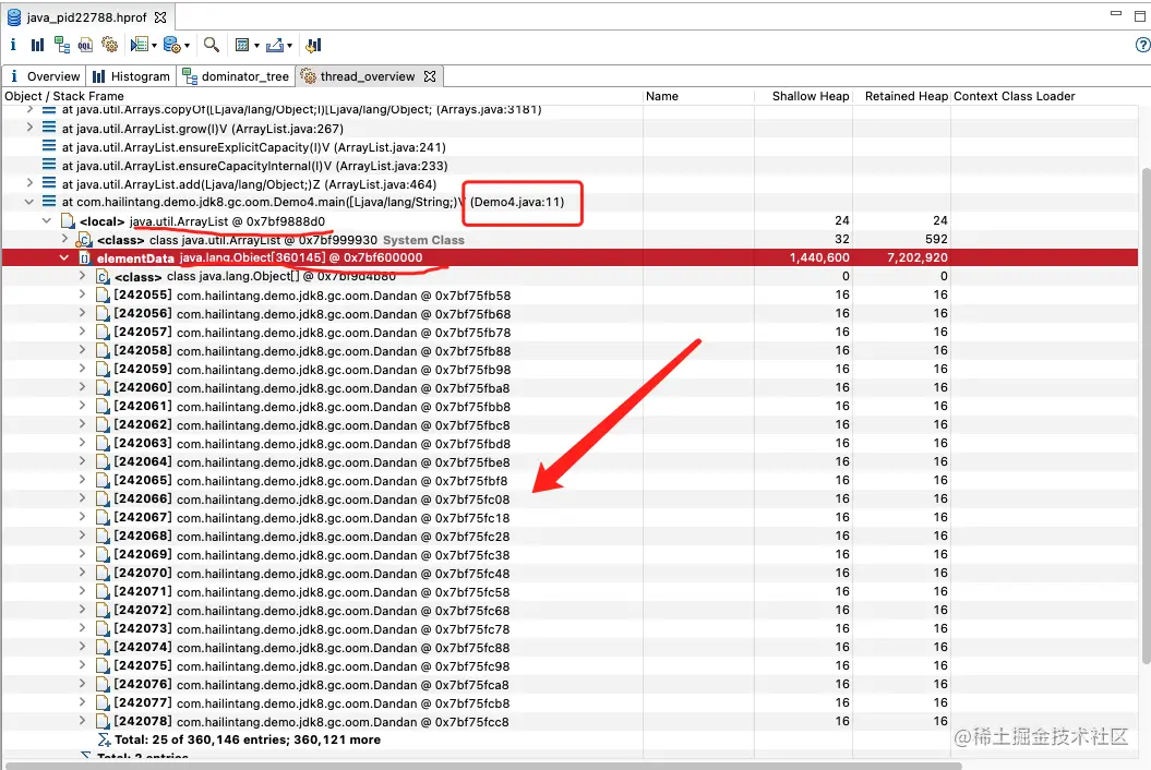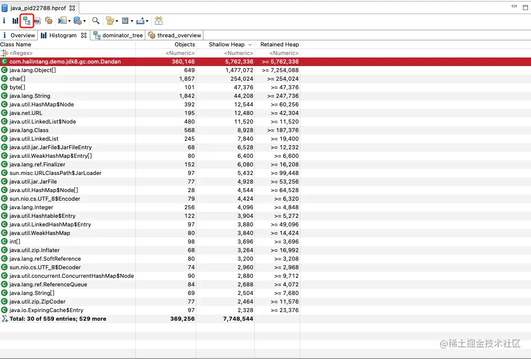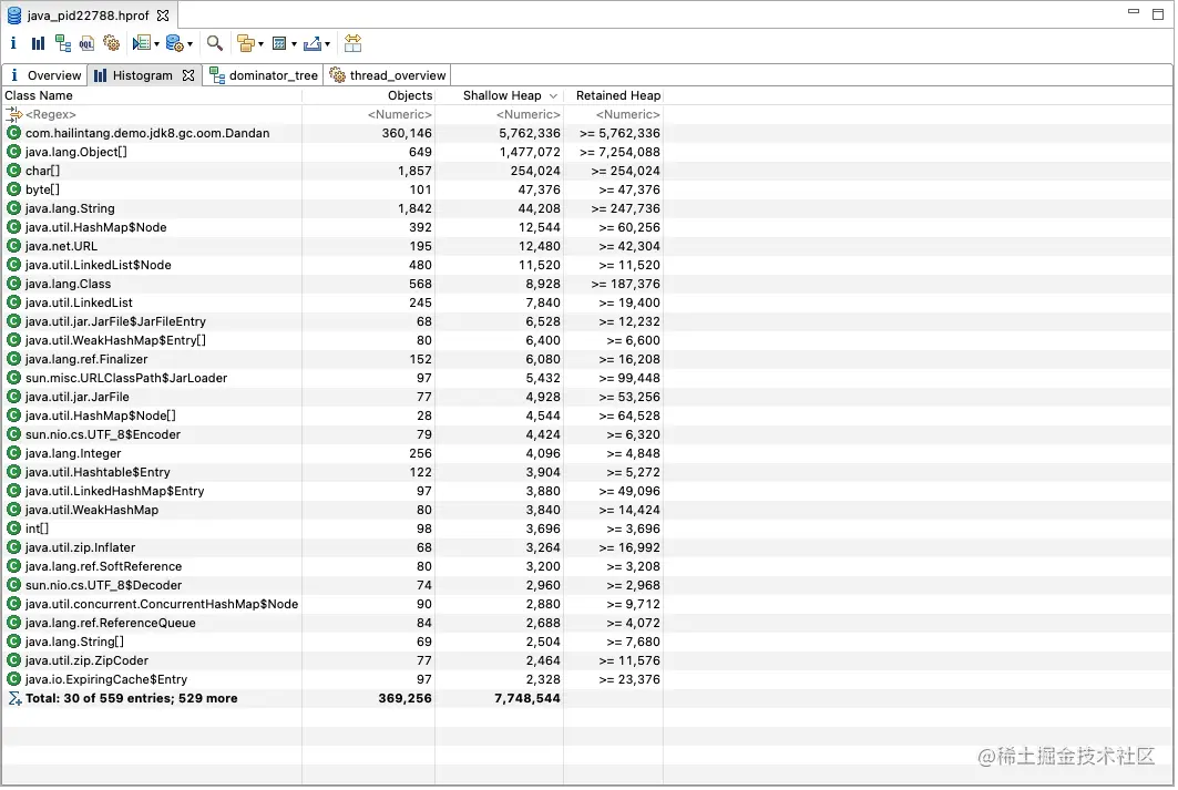 比如这里就是明显的class com.hailintang.demo.jdk8.gc.oom.Dandan这个类占用了过多内存。