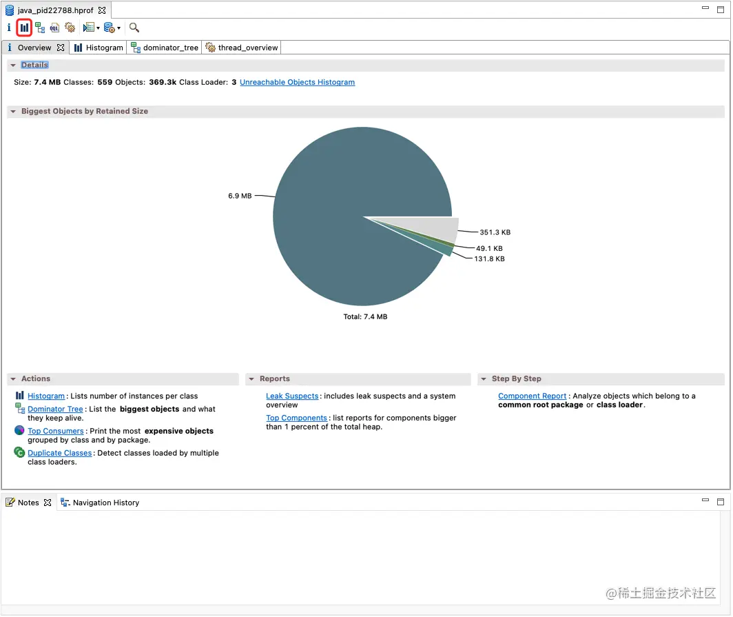 这里,我们首先看看那些对象占用大量内存。按红色框框Histogram按钮