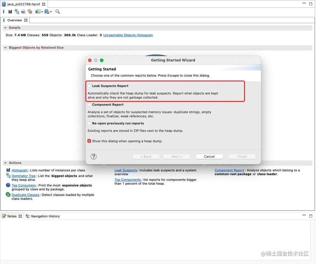 打开hprof文件,如果想要分析内存泄露的话,就勾选红色框框。