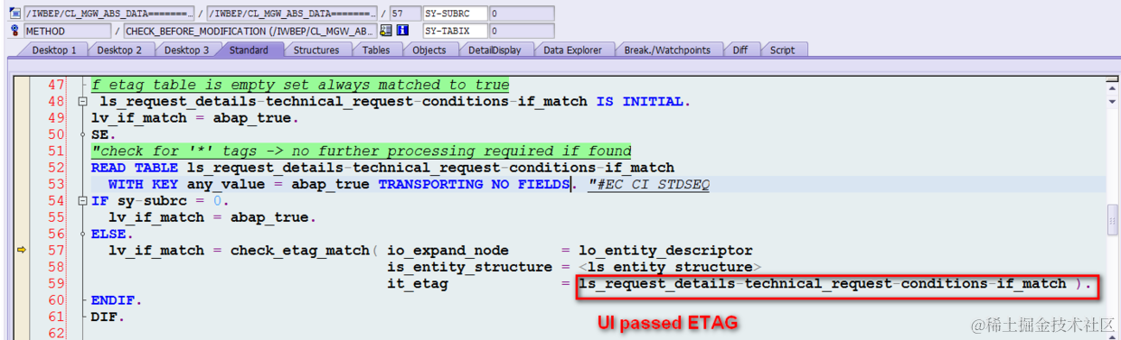 背后发生了什么事请呢?在框架的方法CHECK_BEFORE_MODIFICATION里,框架会把Fiori UI请求传进来的ETAG和当前最新的ETAG做比较: