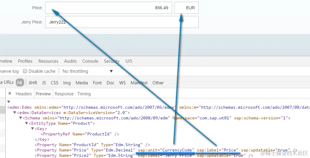 在runtime时,它会自动被渲染成带单位的currency field。后面那个EUR的currency field就像变戏法一样生成了,其实就是sap:unit=”CurrencyCode”这个annotation起的作用。至于框架是如何解析annotation并自动生成currency field,相关的代码和分析都在上述提到的博客Currency example – how Smart field works里。