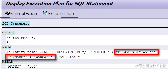 这一点我们可以通过使用事务码ST05得到的trace里得到确认:在运行时P_LANGUAGE被赋以了sy-langu的值E,而P_UNAME被赋以sy-uname的值WANGJER.