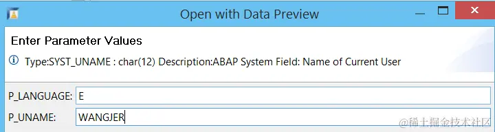 在Open SQL里,这两个参数会自动被分别赋以ABAP编程语言里系统变量sy-langu和sy-uname的值。