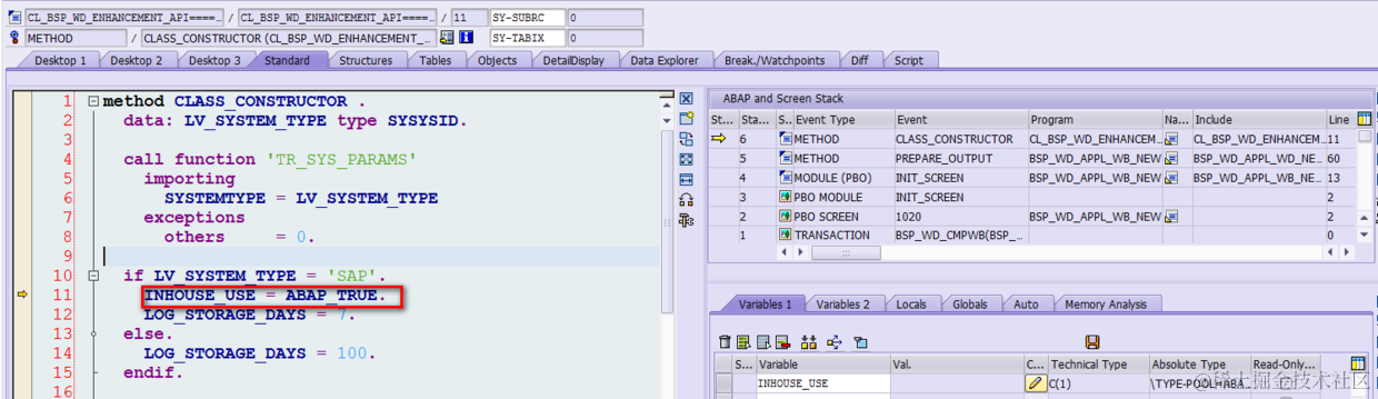 这是因为在图2(看不见Enhance Component按钮)的系统里,该系统的类型被设置为”SAP”系统 - 标志位INHOUSE_USE设置为true。