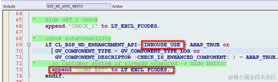 一旦这个标志位为true,Enhance Component这个按钮对应的ID COMP_EXT被加入到内表lt_excl_fcodes里,这导致了该按钮不会渲染在最终的GUI上。