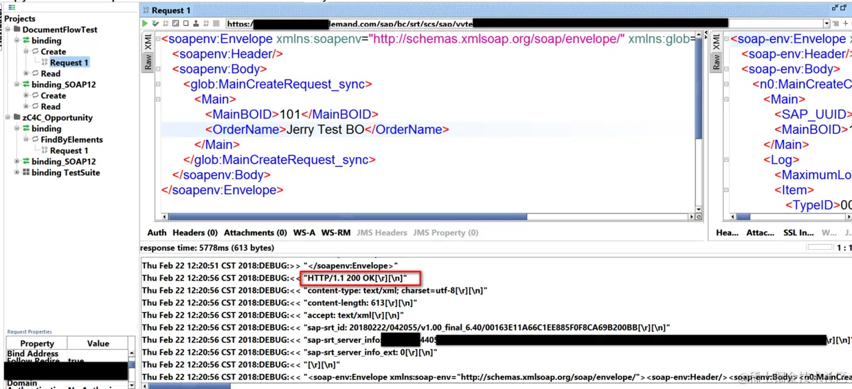 假设我想创建一个新的BO实例,ID为101,OrderName为Jerry Test BO。在Create请求里维护这两个字段的内容,发送请求,得到HTTP 200 OK的响应。