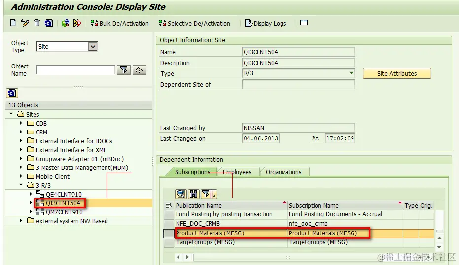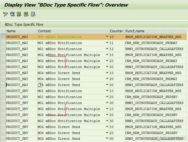 到这里我们发现它就是我们熟悉的在事务码SMOEAC里为某个site订阅它希望监听的众多对象之一。如下图,QI3/504的site注册了”Product Materials(MESG)”的发布,意味着一旦CRM的Product发生了修改,对应的BDOC就会发送到QI3/504.