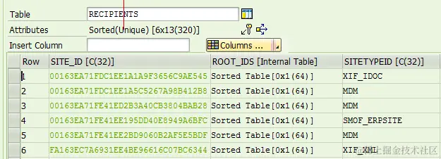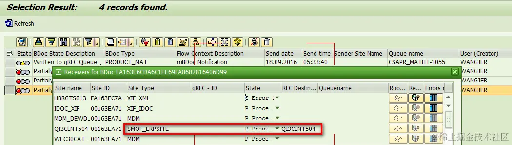 从事务码SMW01里能观察到一个BDOC可能被发送往不止一个目的site去,比如下图所示的5个site都会收到该site,而高亮显示的SMOF_ERPSITE代表ERP系统QI3的client 504会接收到这个BDOC。