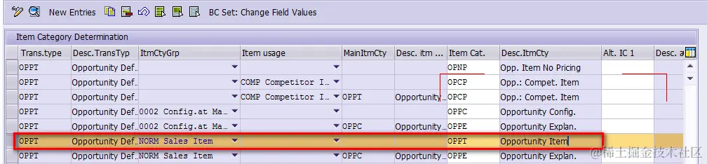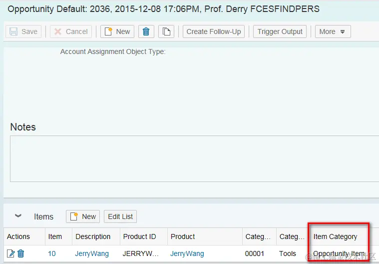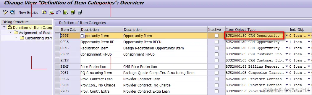 在我的例子里,我创建的Opportunity的Transaction type为OPPT,我插入行项目的Product “JerryWang”上维护的item category的值为NORM。因此按照上图的配置,会自动带出OPPT - Opportunity Item。而OPPT对应的object type BUS2000130维护在如下配置里: