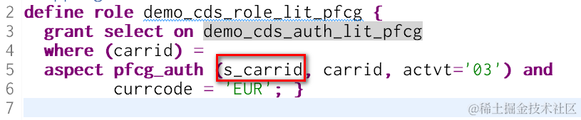 比如下图这个ABAP development studi里创建的角色是为了实现CDS view DEMO_CDS_AUTH_LIT_PFCG的权限控制,里面使用到了权限对象S_CARRID.