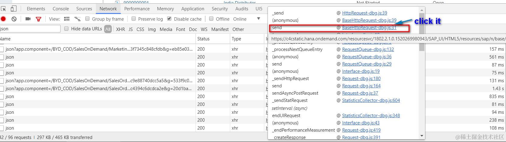 会显示出调用栈,单击send: