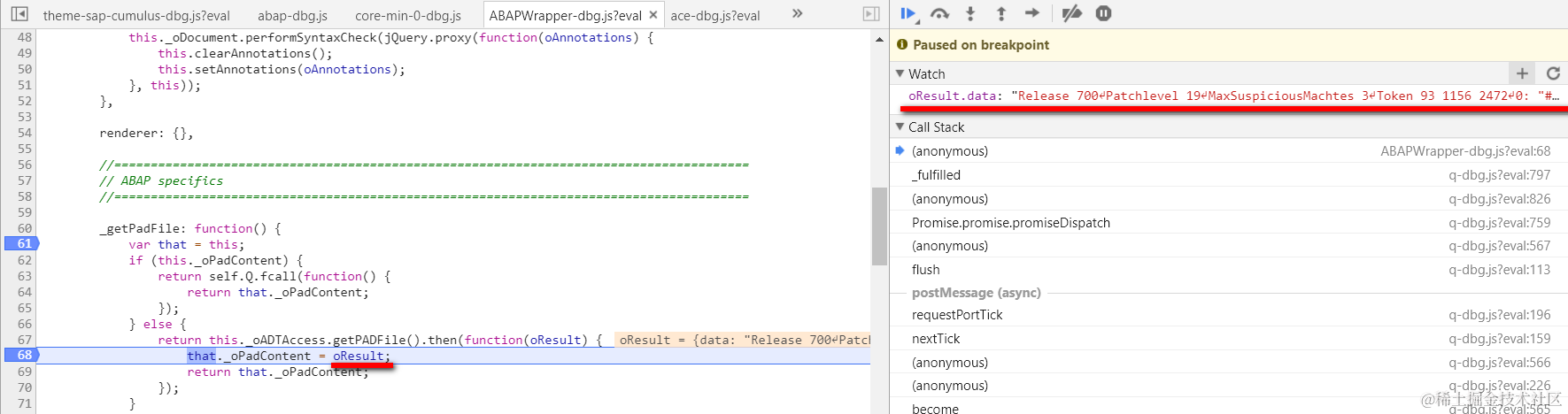 打开ABAPWrapper-dbg.js, 在第68行设置断点。这个函数负责从ABAP后台取PAD文件,该文件和语法高亮有关。