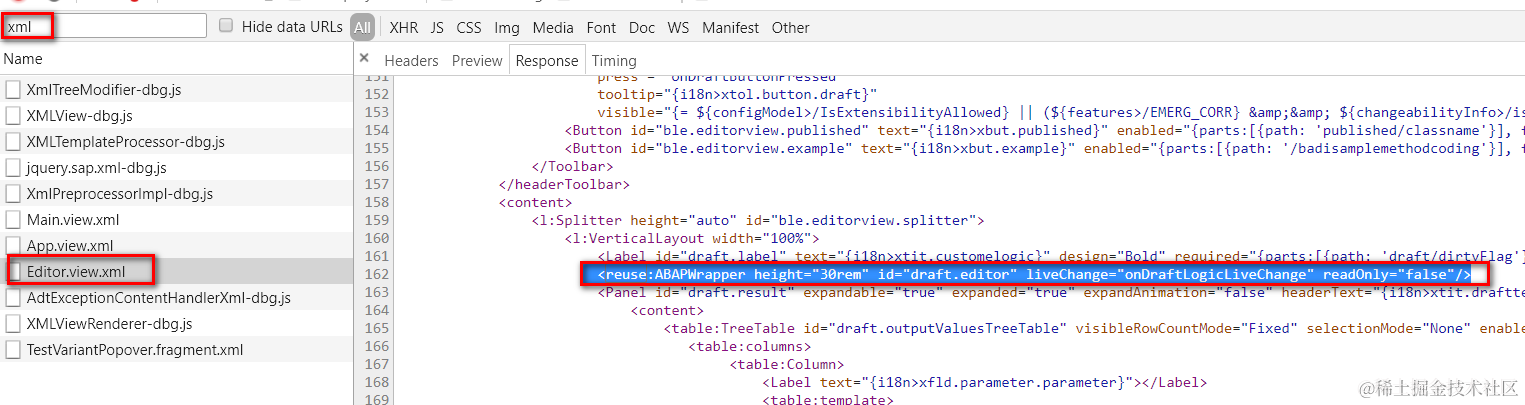 (2). 现在需要找到浏览器里进行ABAP代码编辑的编辑器的实现。在Chrome开发工具里Network tab里输入“.xml”作为过滤条件,于是找到编辑器的Fiori实现: Editor.view.xml