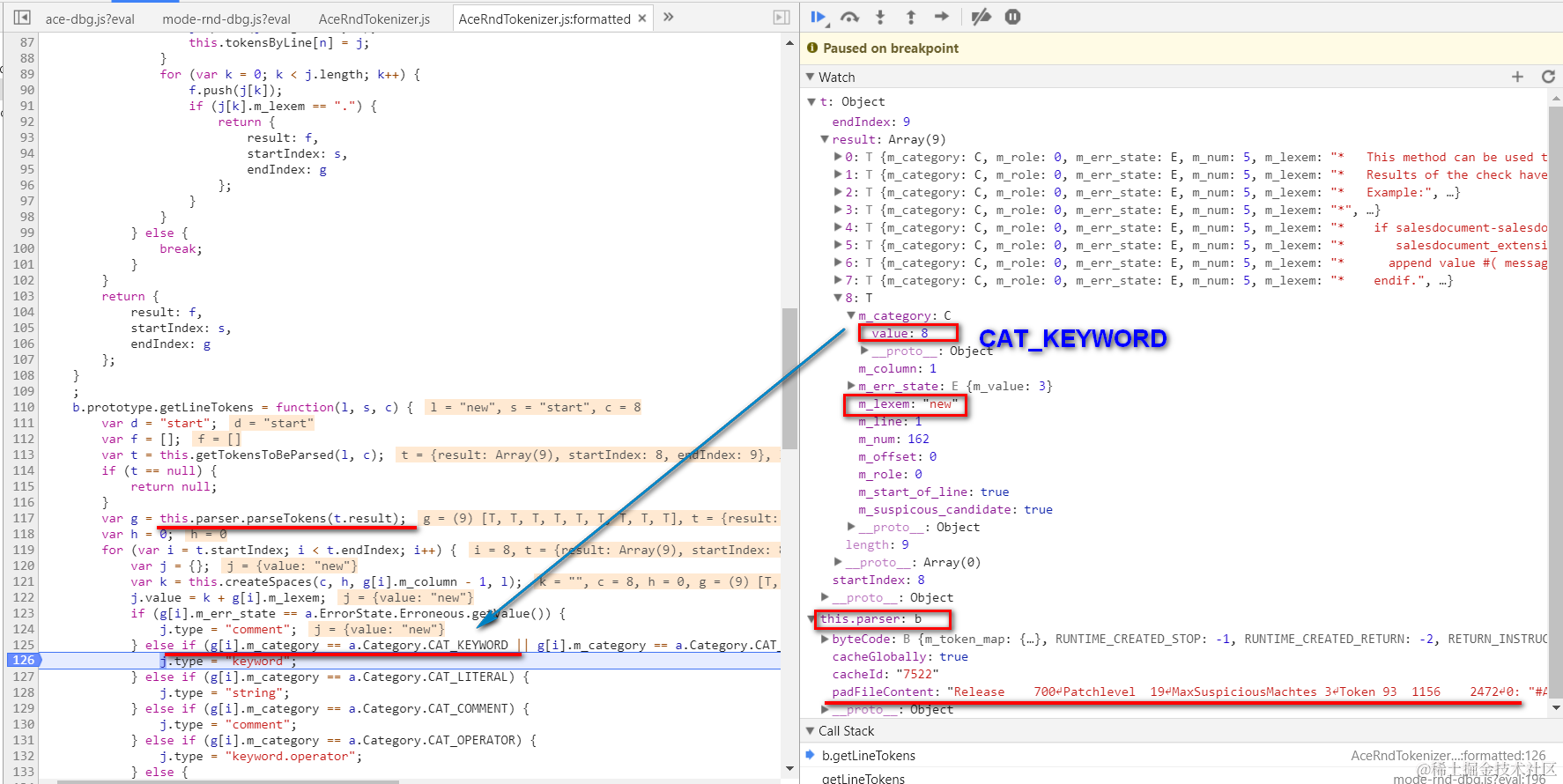 在文件AceRndTokenizer.js里, ABAP解析器按照我们期望的将“new”解析成关键字,因为解析器拥有PAD文件的引用,因此它知道哪些字符串是关键字,哪些是普通变量。