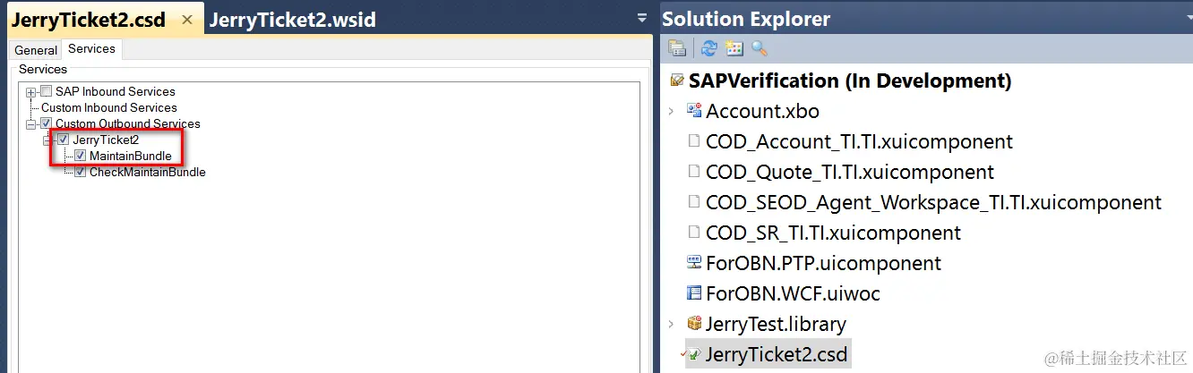 切换到Services tab, 选择Custom Outbound Services->JerryTicket2->MaintainBundle