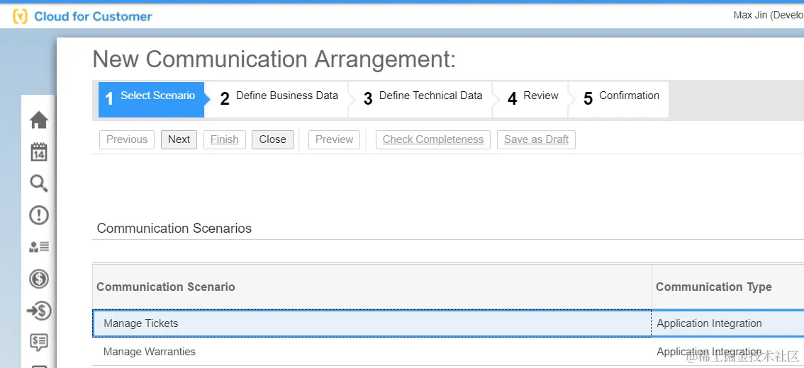 3. 基于前一步创建的communication scenario JerryTicket2创建一个Communication arrangement。至此C4C配置完成。
