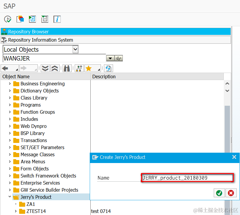 比如我在SE80的开发对象类型里,自定义了一种新的名称为”Jerry’s Product”的开发对象类型,能够像其他所有开发对象一样,通过右键菜单进行创建: