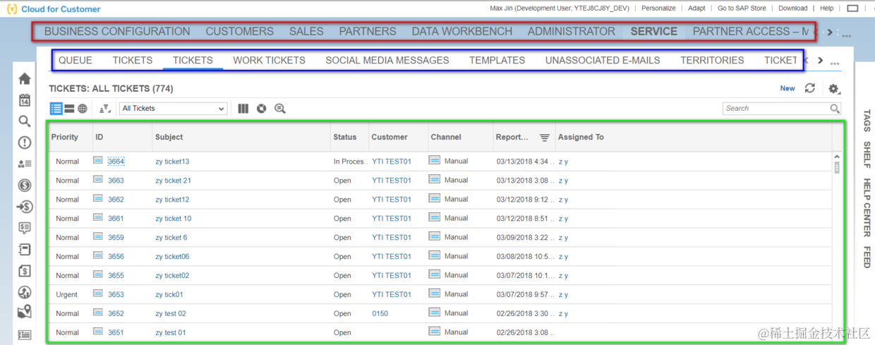 而C4C的标准UI则是基于SAP UI Designer和SAP UI5协作而成的。C4C标准UI也符合著名的“二八定律”,即80%的标准UI布局类似,只是呈现的业务数据有差异。例如下图红色区域我们称之为工作中心(Work Center),蓝色区域为工作中心视图(Work Center View),绿色区域称为Object Work List。