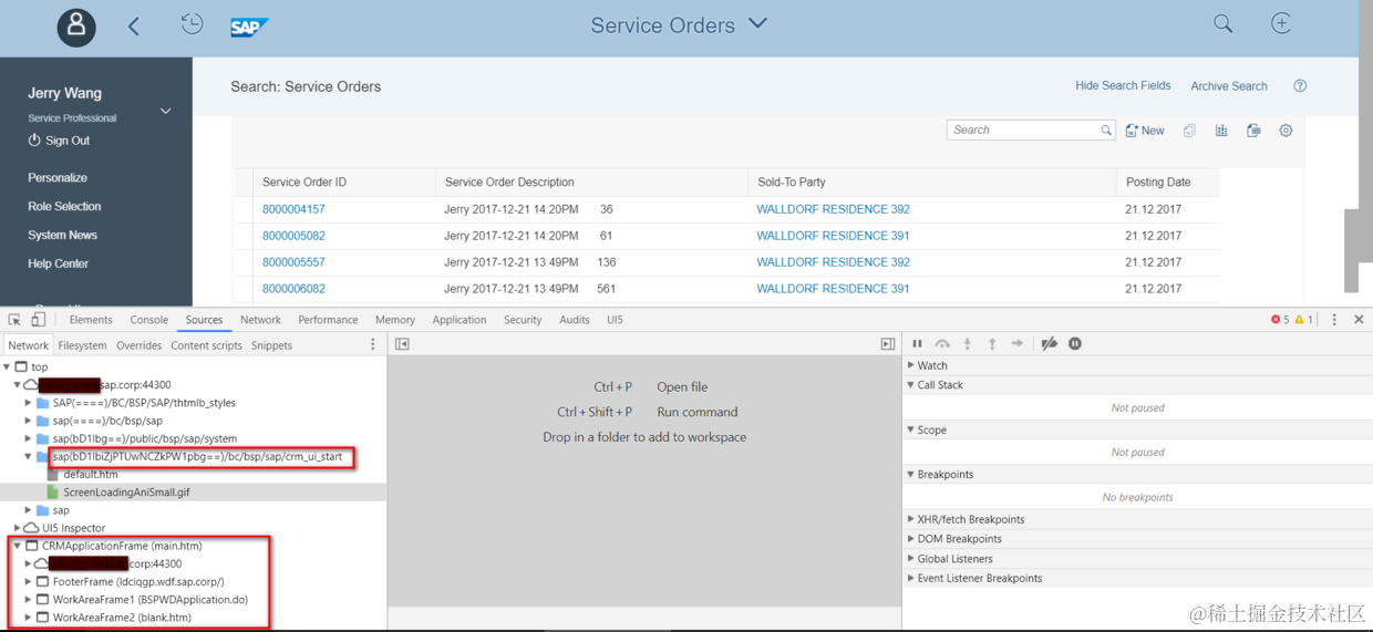 如果看到一个界面风格和原生Fiori应用很类似的UI,您不能判定该UI到底是基于WebClient UI还是SAP UI5,可以打开Chrome开发者工具,倘若能找到下图红色区域所示的CRM Application Frame和带有/bc/bsp的ICF路径,则该UI是基于WebClient UI开发的。