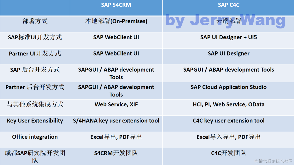 Jerry在S/4HANA for Customer Management(以下简称S4CRM)和Cloud for Customer(以下简称C4C)开发团队都工作过,这篇文章给出这两款产品一些技术层面的比较。