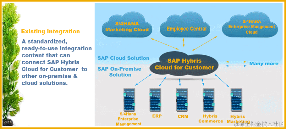 和S4CRM相比,作为一款云解决方案,C4C同其他系统的交互手段要丰富得多。下图是C4C提供的标准集成场景一览: