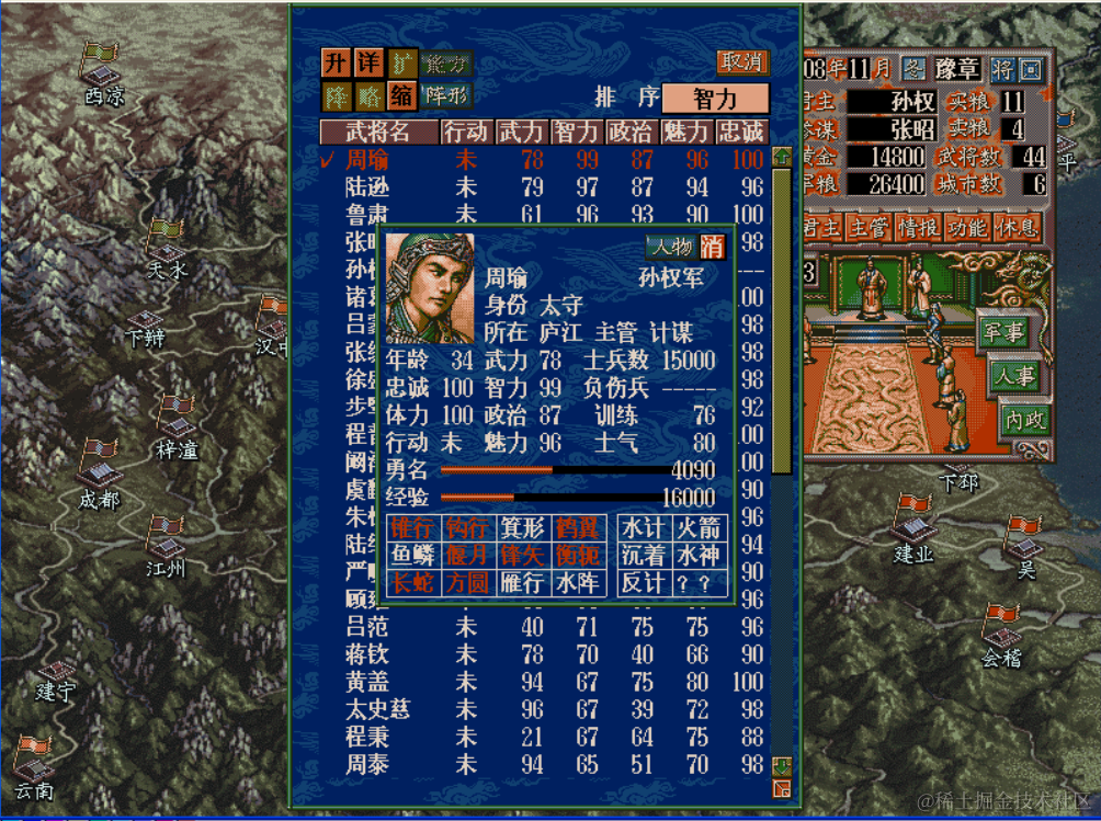 为了写这篇文章,Jerry又一次打开了玩了无数次的三国志V。好吧,周大都督智力值只比诸葛丞相低1点,但是武力值高18点。一代儒将,文武双全,“曲有误,周郎顾”,名不虚传。