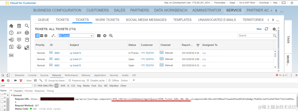 例如Tickets这个视图里的OWL基于的UI模型名称可以通过Chrome开发者工具找到: /BYD_COD/ServiceOnDemand/AgentQueue/SEOD_Ticket_SADL_OWL