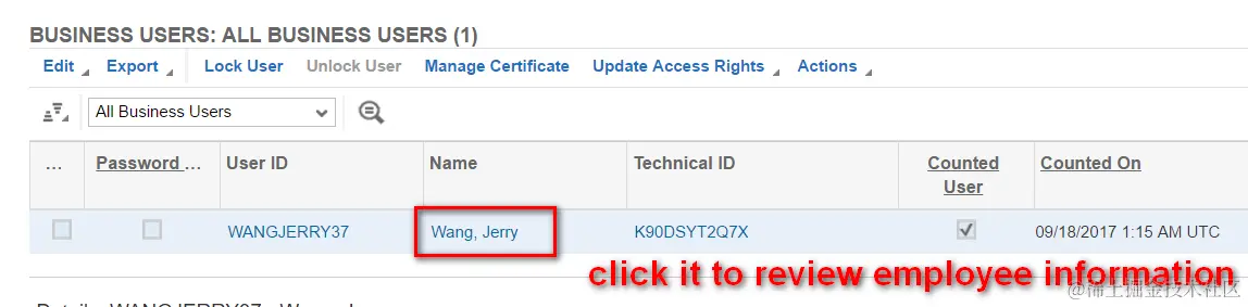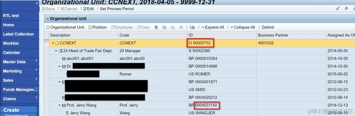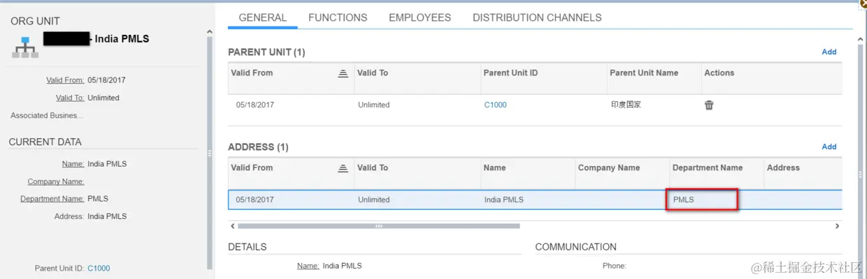 在Employee的Organization Data区域内看到分配的组织名称,如下图红色下划线所示: