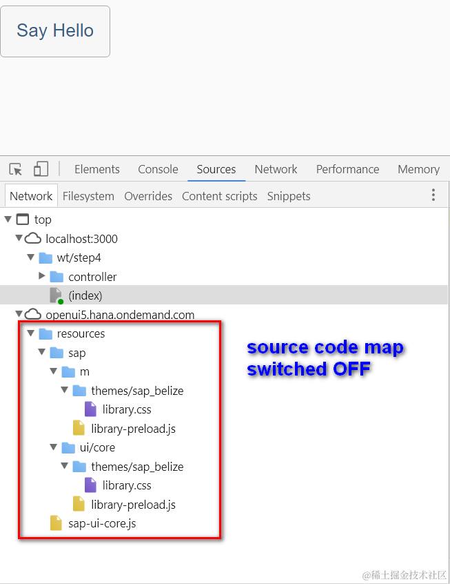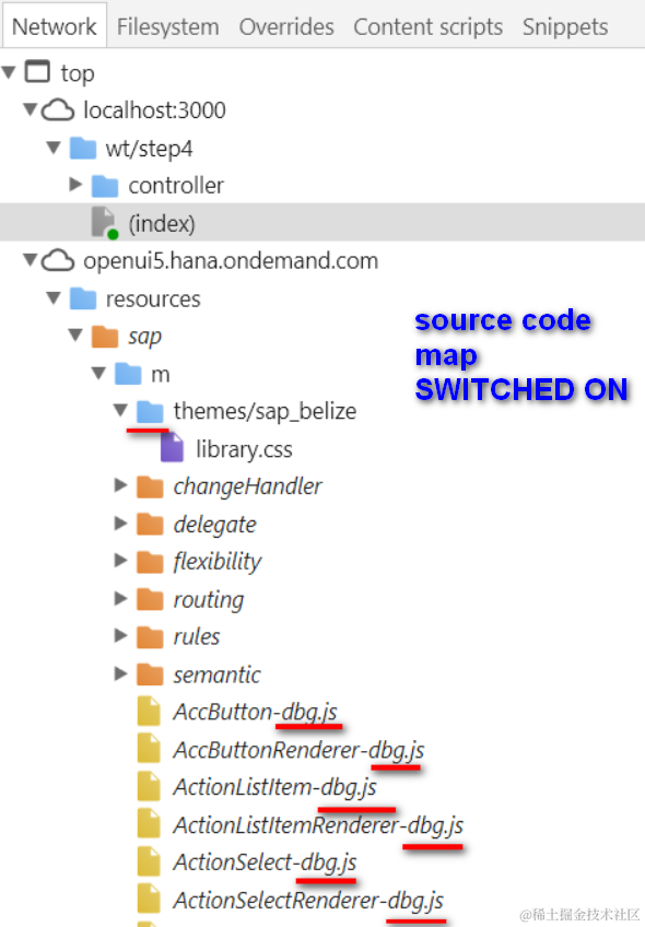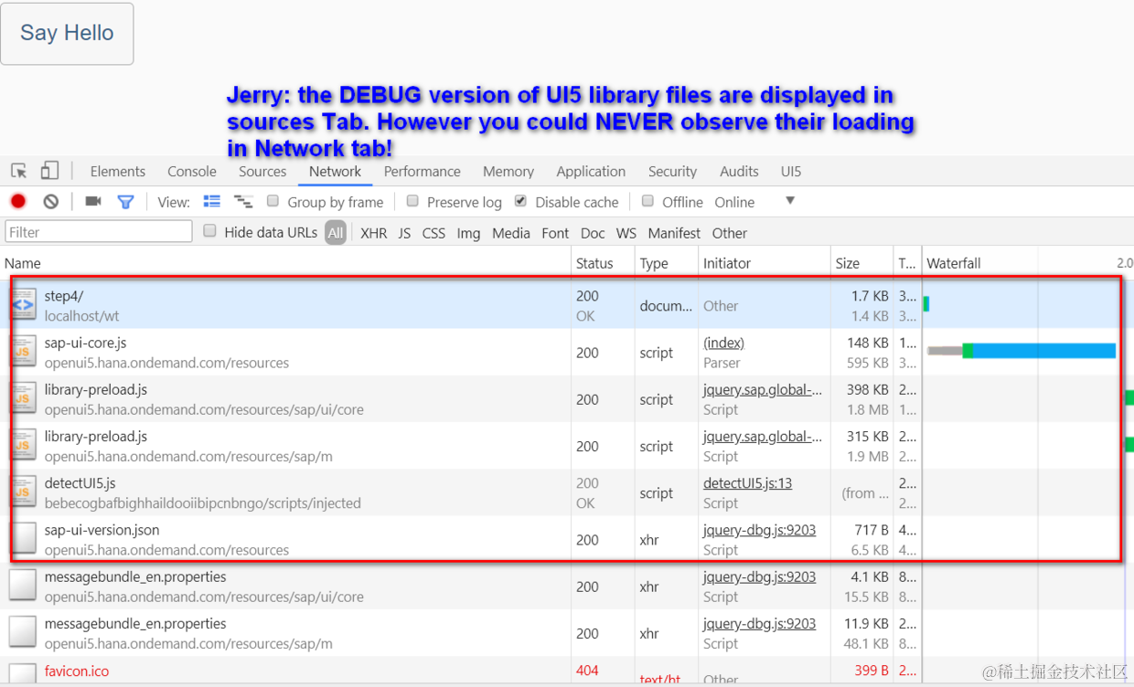 然后浏览器里访问这个UI5应用,我们就能在Chrome开发者工具里看到这些UI5库文件的调试版本(.dbg.js)。但是在Chrome开发者工具的Network标签里,我们观察不到这些调试版本文件的加载。那么问题来了:这些.dbg.js文件从哪里来的?