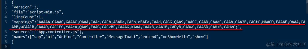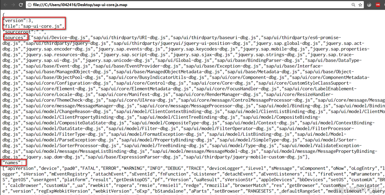 这个文件的后缀.map给了我们提示:其作用就是维护位置映射关系,将sap-ui-core.js(压缩之后的文件)里的代码位置映射到压缩之前的代码位置(来自压缩之前的文件名,代码行数,代码列数,涉及到的压缩之前的JavaScript变量名)。