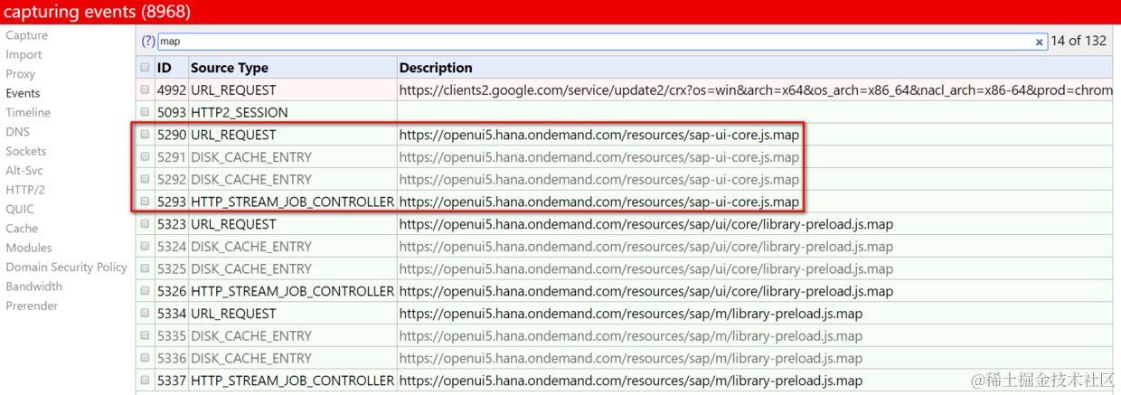 在Chrome里输入url: “chrome://net-internals/#events”, 结果显示确实有一个url请求去访问sap-ui-core.js.map, 只是因为本地磁盘缓存能响应该请求, 因此没有产生真正的网络请求: