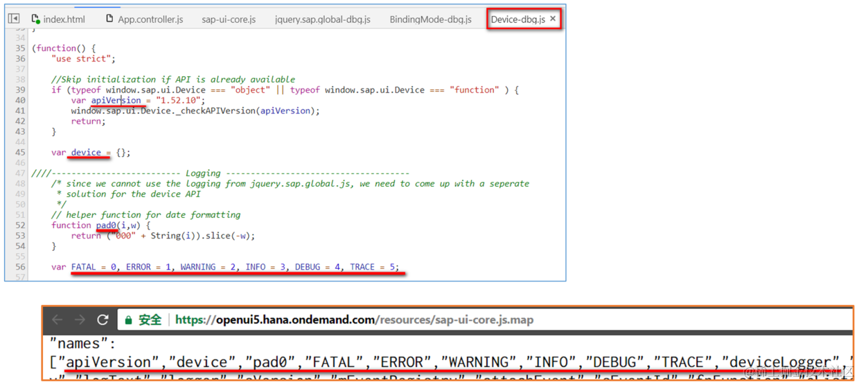 下面是一个例子,体现了原始文件之一Device-dbg.js里的变量名称和其在sap-ui-core.js.map文件里的names数组里的对应记录,方便您理解。